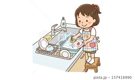 一個孩子在幫忙(穿著圍裙洗碗)