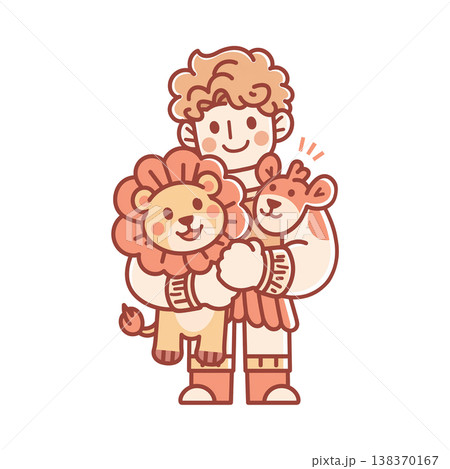 Flat Vector Illustration of a Strong Muscular Chibi Samson Character Holding a Cute Lion Inspired by the Biblical Story of Strength