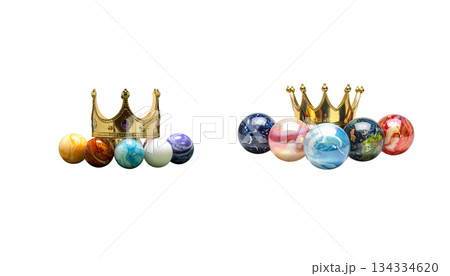 Colorful golden crown and 3D glass ball decoration on white background.