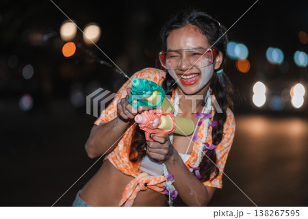 Playful woman holding two colorful water guns at Songkran night festival, smiling with white powder on her face and bright bokeh lights behind, capturing fun portrait, holiday action and street