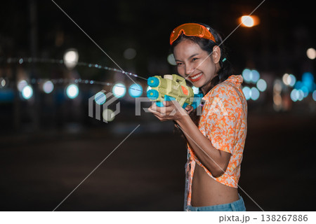Portrait of smiling young woman holding water gun during Songkran night celebration, with wet face, soft bokeh lights and festive styling, showing cheerful Thai holiday mood, street fun and summer