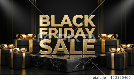 Luxury 3D Gold Black Friday Text on Black Marble Podium