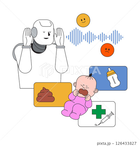 一組可以交談、調查、產生和編程的人工智慧機器人 [向量插圖素材]