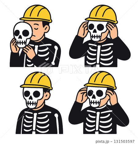 Skeleton worker hard hat costume mask cartoon illustration safety humor Halloween