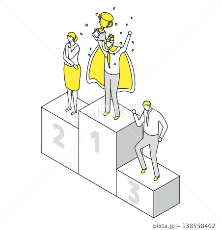 等距線描插圖,描繪了一位商人站在頒獎台上舉著冠軍獎盃。