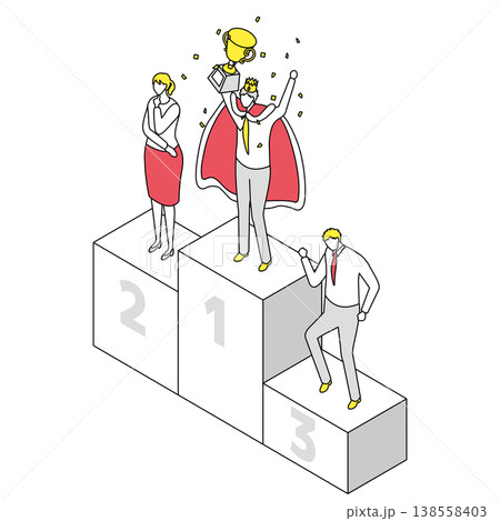 等距線描插圖(紅色),描繪了一位商人站在頒獎台上舉著一座冠軍獎盃。