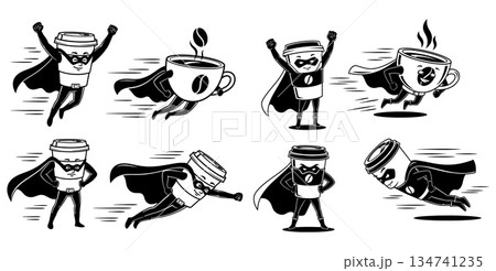 Superhero coffee character set, flying mugs and cups with capes in action poses