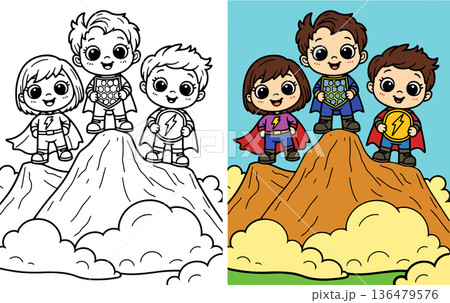 Cute cartoon superheroes standing on mountain top with clouds