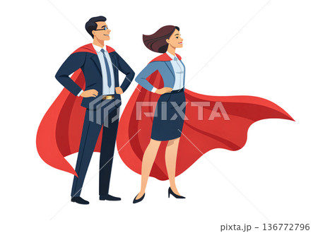 Male and female business people in suits with flowing capes