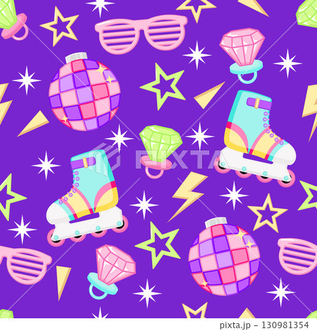 Kawaii retro 90s nostalgia seamless pattern with disco ball, roller skate and diamond ring candy
