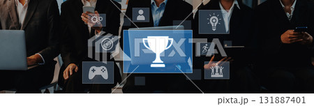 Group of Business Professionals Engaging with Technology and Symbols of Achievement in a Modern Office Setting Trope