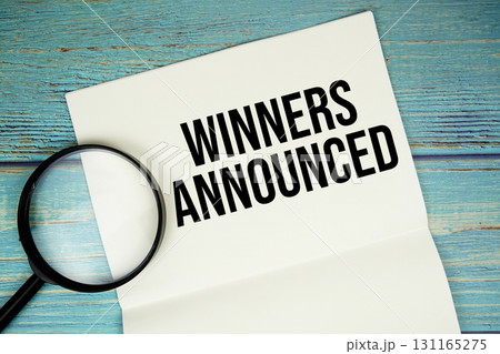 Winners Announced text written on notepad with magnifying glass flat lay on wooden background