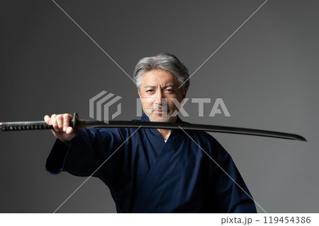 一名身穿和服的中年男子手持劍站立