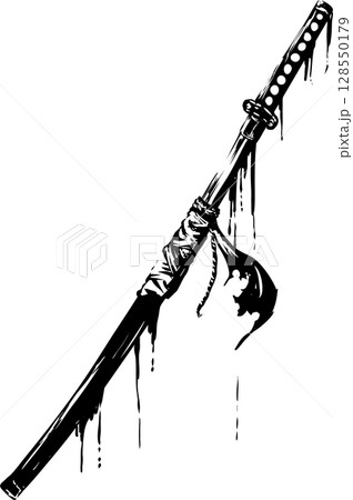 A long, sleek sword with dark blade and detailed hilt, evoking sense of mystery and power. design is reminiscent of traditional Japanese katana styles, with modern twist
