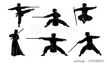 Continuous one line drawing woman Wushu athlete balancing on one leg, holding sword high overhead. Precision, control, grace of martial arts form. Single line draw design vector graphic illustration