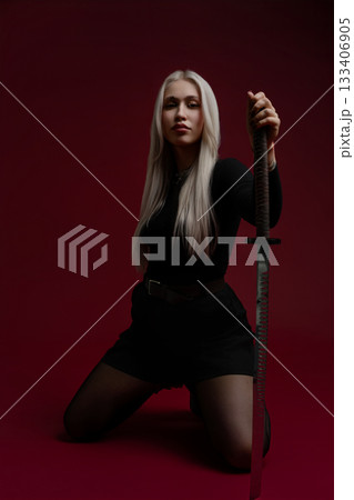 Woman poses in traditional Japanese dress with a sword in a studio setting