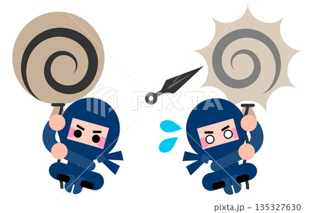 一組可愛的忍者角色投擲手裡劍和戰鬥的插畫。