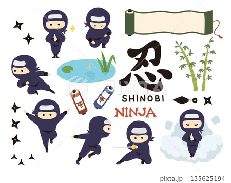 各種姿勢的可愛忍者角色插圖 - 簡單友好的日式吉祥物角色