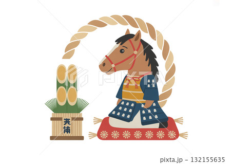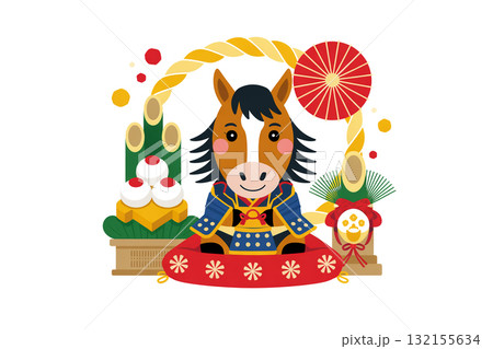 2026 年新年賀卡設計:身穿盔甲的馬武士日式插圖