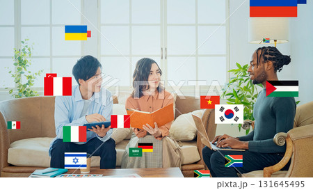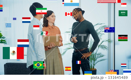 跨國團體和旗幟在辦公室進行對話