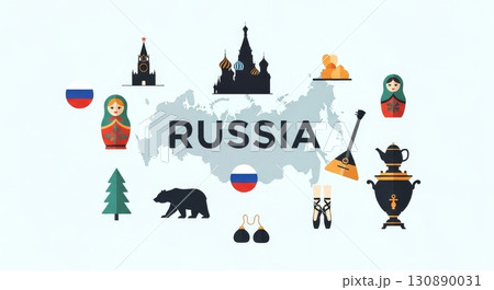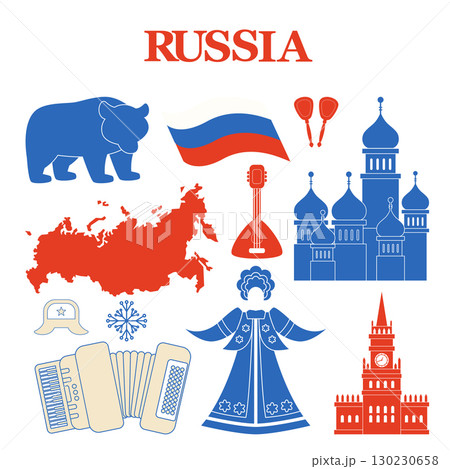 Collection of colorful icons representing Russia including bear map of the country balalaika accordion traditional clothing vector set captures the key cultural and national symbols illustration