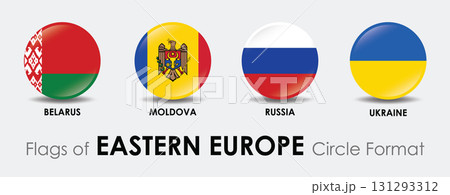 Flags of Eastern Europe displayed in circle format, showcasing national symbols of Belarus, Moldova, Russia, and Ukraine