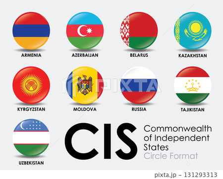 CIS circle features flags of member countries showcasing unity and diversity. design highlights Armenia Azerbaijan Belarus Kazakhstan Kyrgyzstan