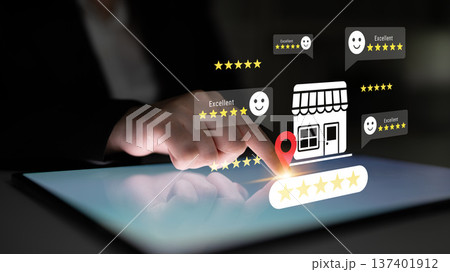 Hand Reaching to Touch Digital Screen with Store Icon and Positive Reviews in Background Signifying Online Reputation Management and Customer Feedback Gantry