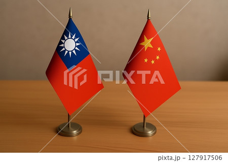 桌子上擺放著台灣和中國的國旗
