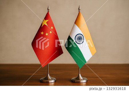 桌子上擺放著中國國旗和印度國旗。