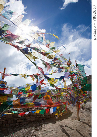 Buddhist prayer flags, Comic village, Spiti Valley, Himachal Pradesh, India