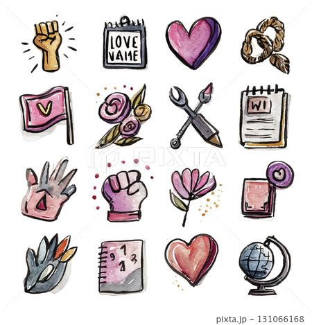 Watercolor illustrations of love, hope, and unity symbols including hearts, flowers, hands, and globes, expressing affection and connection