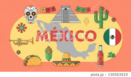 Mexico Cultural Symbols Vector Illustration with Map and Traditional Elements