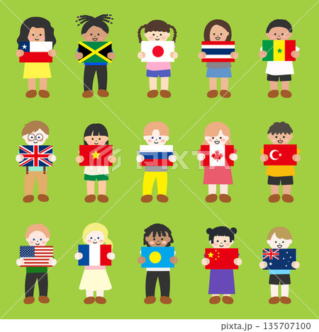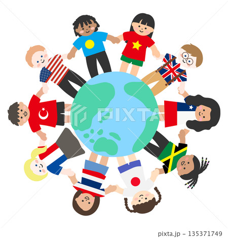一群身著國旗圖案服裝的兒童手牽手環遊世界。
