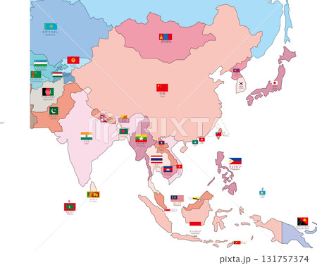 亞洲地圖,國家特定顏色編碼,國旗和國家名稱層分割