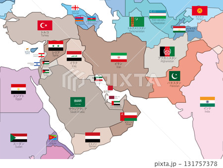中東地圖 - 國家顏色編碼、國旗和國家名稱層