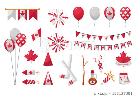 Canada Day-themed balloons and gifts on a bright red background, featuring iconic symbols like the Canadian flag and maple leaf