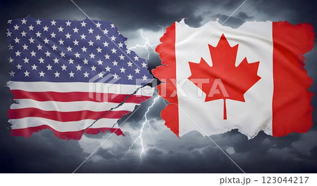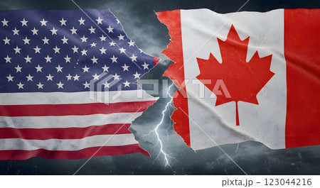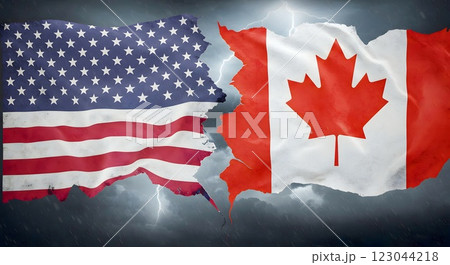 Torn USA and Canada Flags Under Stormy Sky with Lightning