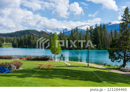 Jasper National Park summer landscape, Alberta, Canada. Lakeside of Beauvert Lake, Lac Beauvert Trail. Jasper Park Lodge.
