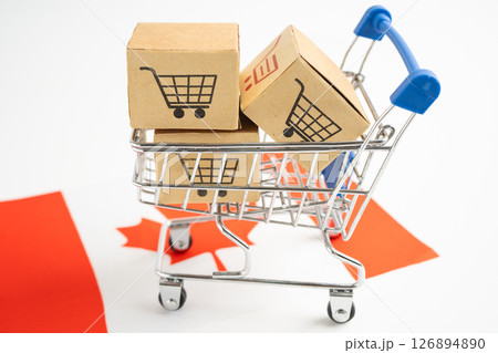 Box with shopping online cart logo and Canada flag, Import Export Shopping online or commerce finance delivery service store product shipping, trade, supplier.
