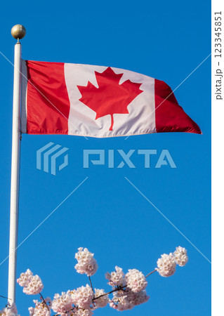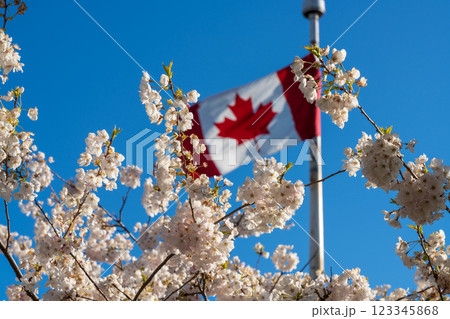 Close up National Flag of Canada and cherry blossoms in full bloom. Concept of canadian urban city life in spring time.