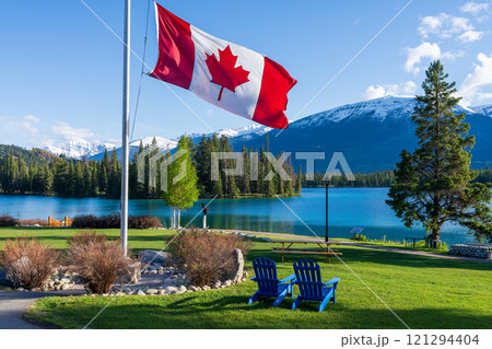 Canadian flag and mountains and trees. Jasper National Park summer landscape. Lac Beauvert Trail (Beauvert Lake).