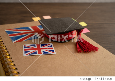 UK flag with graduate hat on english language book.