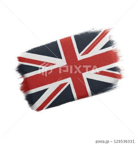 Painted depiction of Union Jack flag, symbolizing United Kingdom, is shown with textured brushstroke effect. flag features red, white, and blue colors, representing British heritage