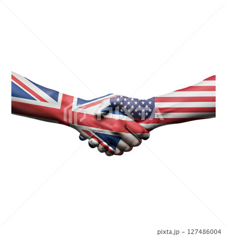 United kingdom and united states flags painted on hands in a diplomatic handshake