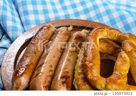 Pretzel loaf and sausage on a wooden tray with a blue checkered tablecloth or napkin background. Concept of Oktoberfest. Bavarian German culture festival decoration symbol