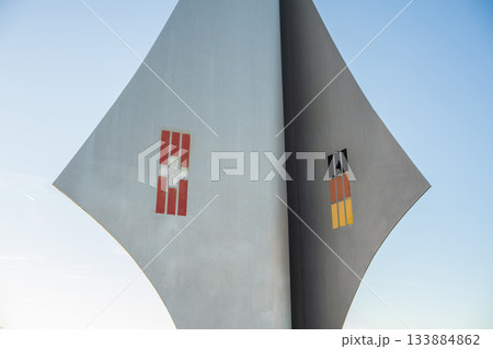 瑞士巴塞爾城市州德雷蘭德雷克三重邊界紀念碑金屬結構的特寫