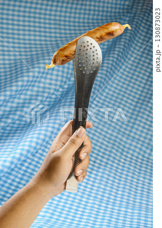 Human hand holding a sausage with tongs with a blue checkered tablecloth or napkin background. Concept of Oktoberfest. Bavarian German culture festival decoration symbol