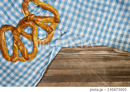Top view of pretzel loaf on a blue checkered tablecloth or napkin with a wooden table background. Copy space. Concept of Oktoberfest. Bavarian German culture festival decoration symbol