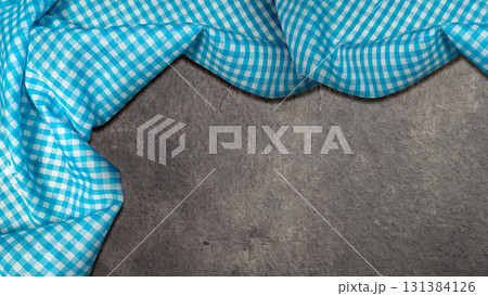 Top view of a blue checkered tablecloth or napkin with a black wall background. Copy space. Concept of Oktoberfest. Bavarian German culture festival decoration symbol